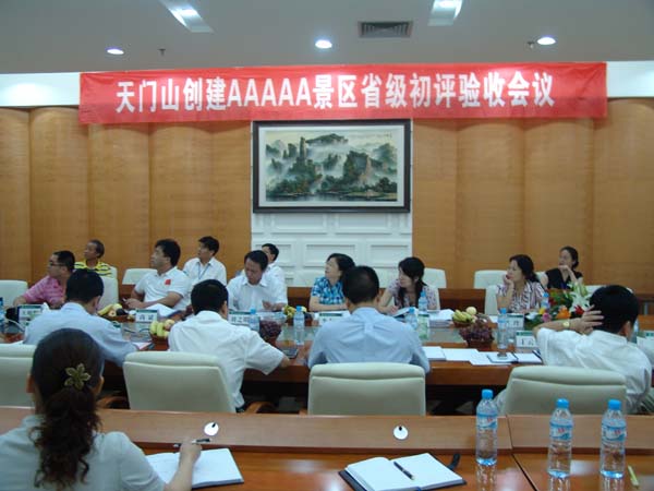 8月12日上午,天門(mén)山創(chuàng)建AAAAA景區(qū)省級(jí)初評(píng)驗(yàn)收會(huì)議在天門(mén)山索道下站會(huì)議室召開(kāi)。省旅游局副局長(zhǎng)劉之明,省旅游局規(guī)劃處處長(zhǎng)尚斌,省旅游局規(guī)劃財(cái)務(wù)處處長(zhǎng)李志斌,省旅游局規(guī)劃財(cái)務(wù)處副處長(zhǎng)黃可,省旅游局規(guī)劃財(cái)務(wù)處副主任科員王朝暉以及衡陽(yáng)市旅游局規(guī)劃科科長(zhǎng)王玲代表省評(píng)定組出席了會(huì)議。張家界市副市長(zhǎng)肖凌之,張家界永定區(qū)區(qū)長(zhǎng)陳競(jìng),張家界永定區(qū)副區(qū)長(zhǎng)張?jiān)诜,張家界市旅游局局長(zhǎng)丁云勇,張家界市旅游局副局長(zhǎng)谷中元,張家界區(qū)旅游局局長(zhǎng)吳文斌等張家界市區(qū)相關(guān)領(lǐng)導(dǎo)也出席了會(huì)議。