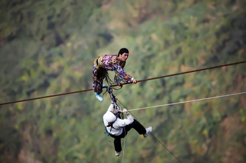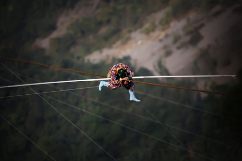 10月18日,新疆達(dá)瓦孜傳人賽買提·艾山在張家界天門山景區(qū)進(jìn)行目前世界最大坡度39°高空鋼絲的極限挑戰(zhàn)的途中發(fā)生意外,在距離終點(diǎn)約50米處跌坐在鋼繩上,最終被迫放棄挑戰(zhàn)。具精確統(tǒng)計(jì),本次挑戰(zhàn),賽買提·艾山行走的長(zhǎng)度為650米,鋼繩坡度為39°,所用時(shí)間為49分鐘,雖然沒有到達(dá)原計(jì)劃的700米終點(diǎn),但是他也已成功挑戰(zhàn)了目前世界最大的高空鋼絲坡度39°。意外發(fā)生后,天門山景區(qū)預(yù)先安排的安全人員立即展開救援,歷時(shí)1個(gè)多小時(shí)將賽買提-艾山順利從鋼繩上救下。