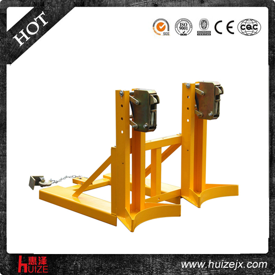 2.大圓弧托架 純機械機構(gòu)設(shè)計可與叉車方便地配合,僅依靠叉車的動作,不需要其它的動力,可自動一次搬運2個桶, 能處理更多類型的桶,包括鋼制油桶和塑料油桶, 能在集裝箱等這樣狹小的環(huán)境內(nèi)裝卸桶裝物質(zhì),可極大地提高空間利用率, 與貨叉連接配有自鎖裝置確保油桶夾在坡度上和顛簸路面使用時不會滑落.