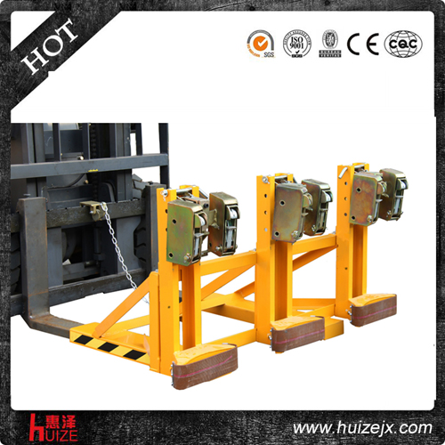 重型三油桶夾具單鷹嘴純機械機構設計可與叉車方便地配合,僅依靠叉車的動作,不需要其它的動力,可自動一次搬運3個塑料油桶, ?配置可拆換式柔性耐磨保護墊,有效保護油桶并緩沖叉車行駛過程中的震動, 能在集裝箱等這樣狹小的環(huán)境內裝卸桶裝物質,可極大地提高空間利用率, 與貨叉連接配有自鎖裝置確保油桶夾在坡度上和顛簸路面使用時不會滑落.