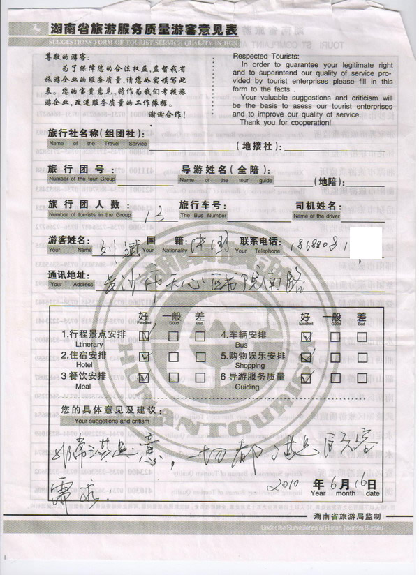 長(zhǎng)沙劉斌一行13人旅游質(zhì)量回饋