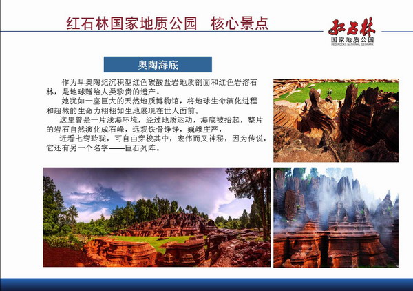 【紅石林國家地質(zhì)公園】景區(qū)區(qū)內(nèi)石峰林立,萬峰疊嶂,千姿百態(tài)的喀斯特地貌展現(xiàn)其獨特而迷人的風采,像古丈紅石林這樣的“紅皮膚”現(xiàn)在是全國唯一的古丈紅。景區(qū)屬地史上所稱的揚子古海,經(jīng)五億年而形成這片美麗的地質(zhì)奇觀。進入石林區(qū)你就進入了一個夢幻般的愛情圣殿,“世界地質(zhì)奇觀”人間愛情樂園”,其間的冰石夫妻、旺夫巖、情郎獻花、萬卷情書等景觀詮釋愛情真諦、奧陶海底、野豬峽、小龍峽等特色線路,另還有地下溶洞,絕壁天坑,千年古木等,整個景區(qū)融紅、秀、峻、奇、絕、古于一身,堪稱“武陵第一奇觀”。讓您親身感受大自然的鬼斧神工!堆嫖鳌2008年9月18日在湘西紅石林開機,其中最驚險的天坑賭命就實景就在紅石林景區(qū)內(nèi)。