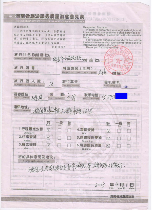 湖南王女士一行16人旅游質(zhì)量回饋單