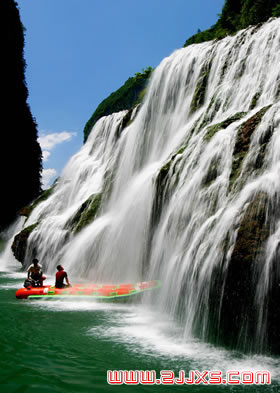 [水洞子瀑布]而鬼門關的急浪更帶著幾分野氣,它是整條漂流線中最大落差的一個,同時也是最富有刺激的一段,和游人游性的情緒高漲的時刻,在有驚無險的情況之下,載著滿船的浪花闖過去。闖過鬼門關我們就可以觀水洞子瀑布了,水洞子瀑布是地下水叢石壁上一個大溶洞中流出,高約70米,寬約45米,它妙在既不循岸而落,也非一瀉而注而是先順崖隙而出,時開時合,好似碎玉遍山,又如摧冰下滑。從懸崖上跌落下瀉,乘船近瀑布,又覺水從天降,那跌沖崖臺的如練垂瓊座,直落碧潭的似玉結帷簾,飄浮船中的若裙帶輕逸,水洞子瀑布既有高山流水之雅,又有飛瀉直落之雄,過水洞子瀑布到繞瀾灘頭,這繞瀾子的名字,是因為石岸的神蛙石到南巖一帶的懸崖,很像秦皇所建的長城吧。在長城的下面圍繞著一條瓊練的玉帶,故稱繞瀾,但繞瀾的浪濤也有著不同別的灘,灘下的淺潭,清澈迷人,峭壁屏立,引人嘆奇,經(jīng)陰陽潭、黃土角等大小五道灘,便來到阻舟河,兩岸青峰陳列,使人聯(lián)想到小三峽的景色,而且三峽之處,就是滿山的翠葉隨著季節(jié)的變遷,時而綠如菌,時而紅似火。靠右岸峰頂有一組造型別致的巖石,他們如筆如柱,如猴如僧,很像是“西游記”中的唐三藏他們師徒四人正向西天出發(fā)呢! |