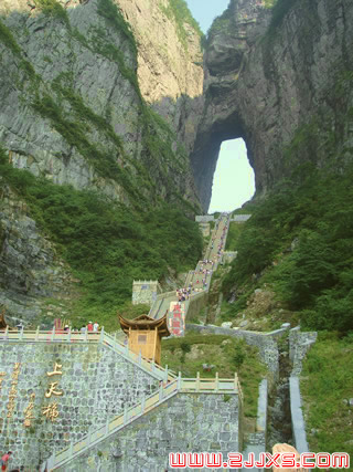 天門洞開景區(qū),位于 天門山山體的中上部,海拔1300 米,是全山四大景區(qū)里唯一不在山頂?shù)。天門洞開景區(qū)因為天門洞而得名,而在天門山天門洞無疑是最有代表性的景點。作為世界最高海拔的天然穿山溶洞,天門洞懸于千尋素壁之上,就象一座鑲嵌在天幕上的通天之門。 1700 多年以來, 這一道奇絕天下的勝景,吸引著無數(shù)的探訪者趨之若騖。特別是1999年,世界特技飛行大師架機(jī)穿越天門洞,在全球引發(fā)轟動效應(yīng),收看現(xiàn)場直播的觀眾就達(dá)到 8 億之多。除了天門洞,天門洞開景區(qū)重要的景點還有上天梯。有著九百九十九級臺階的上天梯,不但是通達(dá)天門的途徑,還是許愿祈福的靈地。