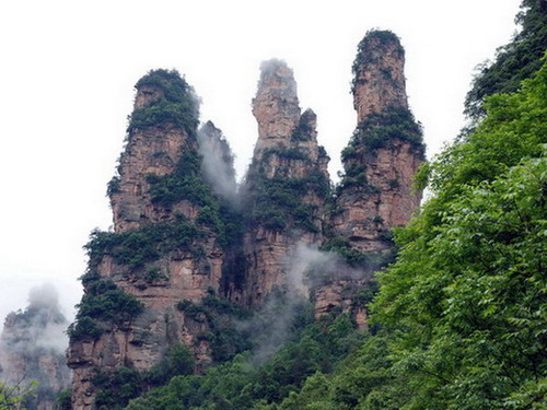 聳立著的三座灰白色的石峰,人稱“三姐妹峰”。每座峰高100多米,上小下大,形似三個(gè)穿著花羅裙的苗族少女。她們立在山梁上,亭亭玉立,若有所思,真是神形兼?zhèn)洹O鄠鬟@是三個(gè)苗姑站在山梁上與情郎對(duì)唱情歌,她們情真意切,在這里唱了三天三夜的苗歌。后來(lái)天上出現(xiàn)七個(gè)日頭,把大地曬裂口了,把樹(shù)木曬枯了,把河水曬干了,把她們?nèi)齻(gè)人哩,燒化為石頭了。