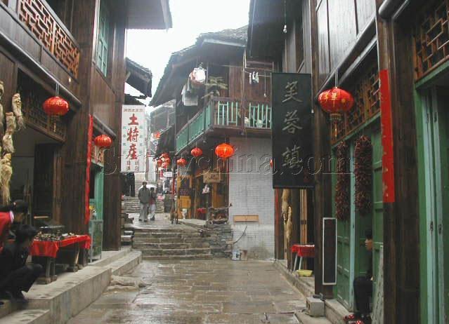 溪洲銅柱現(xiàn)存于芙蓉鎮(zhèn)民俗風(fēng)光館內(nèi)。公元940年,楚王馬希范與溪州刺使彭士愁多年交戰(zhàn)媾和,締結(jié)盟約,劃疆而冶,鑄5000斤銅柱為證。據(jù)史截:“后晉天福四年(公元939),溪州刺史彭士愁與當(dāng)時占據(jù)湖南的楚王馬希范發(fā)生溪州之戰(zhàn)。彭士愁戰(zhàn)敗后于后晉天福五年(公元940年)與馬希范議和,把戰(zhàn)爭的經(jīng)過和議和的條款,鐫刻于銅柱之上。銅柱重五千斤,高丈二尺,入土六心,形為八面,中空,內(nèi)實鉅錢,柱端覆蓋銅頂,銘誓狀于銅柱之上,立于會溪,宋天禧二年(公元1018年)重立時,又羼刻了一些土官銜名。清中葉,柱上銅頂被盜,沉于江心,柱內(nèi)銅錢亦被人以飴粘錢殆盡。清光緒十一年(公元1885年),永順府知府張曾揚建亭保護(hù)。民國年間亭被毀。”銅柱的銅質(zhì),精純光潤;八面所鐫顏、柳體陰文,雖經(jīng)千載風(fēng)雨洗刷,霜雪蝕磨,仍清晰如初。溪州銅柱是研究土家族古代歷史的重要文獻(xiàn)。土家族視銅柱為神物。 古鎮(zhèn)石板街遠(yuǎn)遠(yuǎn)望去,總感覺芙蓉鎮(zhèn)五里青石板街就像一本線裝古籍的書脊,書頁被上蒼之手打開,靜謐而又穩(wěn)重地攤在酉水河邊,那書頁上凌空的吊腳樓和發(fā)生在樓里樓外的悲歡離合便隨歲月而動,演繹出許多鏗鏘溫馨、跌宕起伏的故事來…… 湘西芙蓉鎮(zhèn)這個看上去普普通通的村落,原來是秦漢時土王的王都,古稱酉陽,五代十國時稱溪州。后因電影《芙蓉鎮(zhèn)》在此拍攝,于是人們便把此地叫做芙蓉鎮(zhèn)。 史書記載“位酉水北面,是酉水的重要碼頭,通川黔、達(dá)鄂瀘,舟楫之便,得天獨厚”。 從碼頭開始綿亙而上的石階,那是一條長達(dá)五里貫穿古鎮(zhèn)的青石板路,它沒有名字,于是人們就直接管它叫五里長街。踏上古街,似乎踩在被悠長歲月遺落的碎片上面。不知不覺走到掛有“土家觀瀑吊腳樓”牌匾的民俗博物館前,從手搖腳踏的棉花機、閹豬鳴號的羊角到世代相傳的雕花牙床,近百件散發(fā)著鄉(xiāng)土氣息的民間用具,展示著土家族古老豐富的歷史。看護(hù)人說,這是一位土家族年輕人爬山涉水收集來的,靜靜地訴說著這個小村古老的過去。這棟三層的小樓,一半落在河岸上,另一半?yún)s是由水泥柱支撐著,水泥柱直插河底,任水流日日夜夜地沖刷,小小的吊腳樓仍穩(wěn)穩(wěn)當(dāng)當(dāng)站在那里,任憑時間的流逝。好聰明的土家人,巧借一片水面,竟建起了如此妖嬈的住房。 拾級而上,山路一般的陡峭。兩旁的青瓦木房鱗次櫛比,順山勢而錯落有致。幾家織錦商店已經(jīng)開門,說是商店,不如叫作坊更確切些,因為店里的主要面積,都為織錦機所占領(lǐng),色彩斑斕的挎包、壁掛、床上用品等都掛在墻上,游客不僅可以駐足欣賞姑娘們的手和梭子在織錦機上飛動的瀟灑,還可以慢慢觀賞陳列品的藝術(shù)特色。據(jù)說,當(dāng)?shù)氐墓媚镌瓉碇唤o親人和情郎穿針引線,如今卻生產(chǎn)出異彩紛呈的土家織錦來賣給陌生人,從情感所系的“非賣品”到只有技巧表現(xiàn)的商品,這種生活方式和情感上的跨越,仿佛不過是一夜之間的事。 有趣的是,米豆腐沿街都是,每一家都掛出電影《芙蓉鎮(zhèn)》的劇照,以示自己的正宗。其實在電影拍攝之前,米豆腐就早已是這里的特色,為什么要依賴那一個虛構(gòu)的故事呢?20年前,一部電影把“深居閨閣人未識”的這個小小村鎮(zhèn),從地圖上尋找出來,放在世人面前,然后將影響這里的多少代人,甚至深入到他們的骨髓。從那以后,曾經(jīng)與世隔絕的寧靜被打破了,而這種深刻的影響,大概就是從一碗米豆腐開始。 傍晚還剛剛來臨,長街上的小吃店就紛紛亮起昏暗燈光。這些家庭式小店,全都是當(dāng)?shù)厝藦淖约杭曳殖鲆粔K地方來順帶做的。鮮甜的桂花魚,以及肥美的“天下第一螺”,和米豆腐一樣,成為那里最難忘的美味。在村子里一座貞節(jié)牌坊旁,又發(fā)現(xiàn)清心透涼的另一種美味———冰鎮(zhèn)土家自釀糯米酒。聰明能干的土家人,他們自給自足,自在悠閑地生活著,男人在外打漁,女人在家織布,世世代代,沉浸在自己的文化里面。