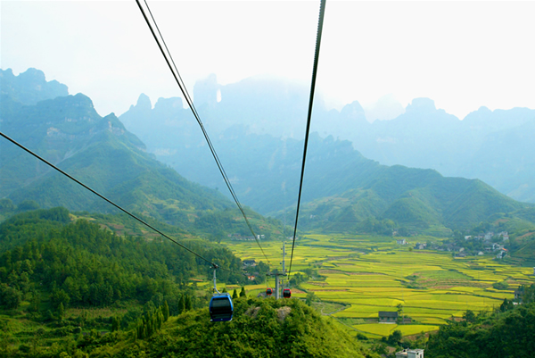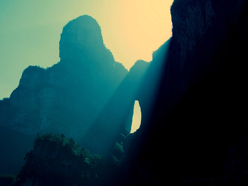 順勢而上,可見幾座遠峰迎面而來,外形如根根箭桿,共有九座相連,傳說是后羿射日的九根箭桿所化而成.美麗的傳說和神奇的景觀,融匯成了天門山的雄偉,奇俊和妖嬈,充盈著整條通天大道的旅程,最終讓人感受到的則是天門山的慧然靈氣!