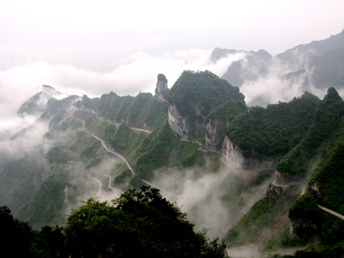 通天大道以進山時的標(biāo)志門為起點,一直通達天門洞腳下,全長 10.77 公里 ,但就在這么短的距離里,它的海拔卻從 200 米 急劇提升到了 1300 米 ,大道兩側(cè)絕壁千仞,空谷幽深, 180 度的急彎此消而彼長,層層疊起,“ 堪稱天下第一公路奇觀 ”.中國書法協(xié)會常務(wù)副會長沈鵬先生走過通天大道后欣然為其題字“曲道通天”,字體遒勁挺拔,與通天大道的奇絕天下相融為一體.