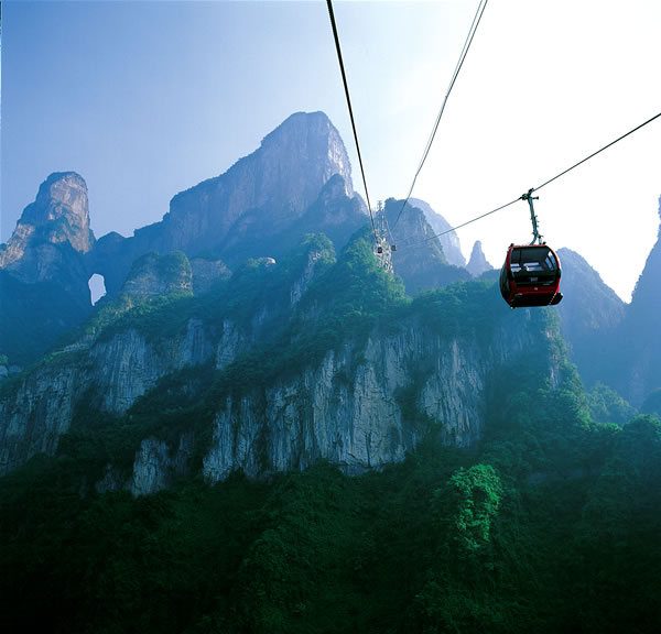 隨通天大道盤旋而上, 可以領(lǐng)略到天門山索道與藍天白云相映成趣的蔚蔚壯觀和奇絕高險,還能在經(jīng)過索道中站房時感受大自然的奇妙和飄然,那座頗似馱滿元寶的烏龜?shù)纳椒褰凶鼋瘕旕W元寶.再收回遠眺的目光來看近前,有一道天然畫屏橫在面前,這就是天門畫屏了.仔細觀望認真度量之后會覺得整座天門山就如一幅雄踞于天際的妙筆丹青.綠,是生機盎然的氣息;白,是流溢飛揚的風(fēng)采;黑,是雄奇崔巍的俊朗;氤氳的,則是如竺如籟的仙韻.一任斗轉(zhuǎn)星移,風(fēng)云變幻,天門山始終以壁立萬傾的雄偉粗獷揮灑著“張家界之魂”的磅礴和雄渾.