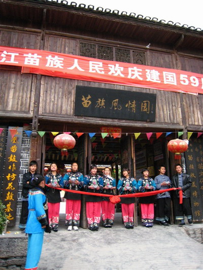 稱山江為總兵營(yíng)則源于清朝鎮(zhèn)壓苗民起義時(shí)在此駐兵設(shè)過總兵營(yíng)房。至于叫“山江”則因解放后在寨西北山上修了座山江水庫,苗寨缺水、水庫修成后觀者如潮,人們稱“叭固”為山江,久之,行政區(qū)名便隨之改為“山江”。山江,保留著古老的苗家習(xí)俗。鮮麗奪目的苗族服飾,情調(diào)別致的攔門酒,風(fēng)格獨(dú)特的卡鼓、攔路歌、邊邊場(chǎng),會(huì)使你耳目一新,如癡如醉;還有傳統(tǒng)節(jié)日“四月八”的跳月跳花,“六月六”的山歌對(duì)唱,又會(huì)使您心動(dòng)神搖,嘆為觀止。游鳳凰不到山江,你將終生遺憾。苗族服飾最具特色是女裝。出門時(shí),頭上戴著青絲帕,身上穿著滾邊繡花無領(lǐng)滿襟,滾邊繡花褲;頭帕和上衣綴滿銀飾,有銀帽、銀鳳冠、銀項(xiàng)圈、銀手鐲、銀戒子、銀牙釬、銀掛鏈、銀腰帶等,雍容華貴,落落大方。山江女裝,衣著色彩鮮麗,銀飾造型精美,是苗族女裝的精品。攔門酒是苗家古老的習(xí)俗,一些地方直呼“識(shí)友酒”。