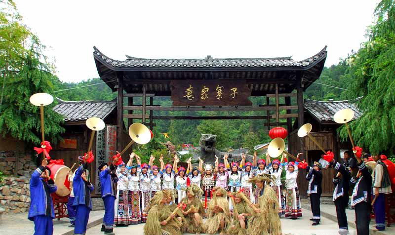 在張家界264平方公里石英砂巖絕壁頂上、3103根神秘山峰之巔至今唯一保存著一座土家山寨----袁家寨子。這里居住著一群喝虎乳長(zhǎng)大的土家后裔,他們至今還沿襲200年前的后產(chǎn)、生活方式。這座寨子構(gòu)建獨(dú)特,是按照動(dòng)物形體建造的仿生建筑。寨民靠耕種“空中田園”為計(jì),為游人現(xiàn)場(chǎng)表演碾、榨、磨、碓、織等原始傳統(tǒng)手藝;通過唱、跳、哭、咒、符等另類的習(xí)俗和神秘的信仰,演繹著高山土著民的“人、神、情”秘訣。